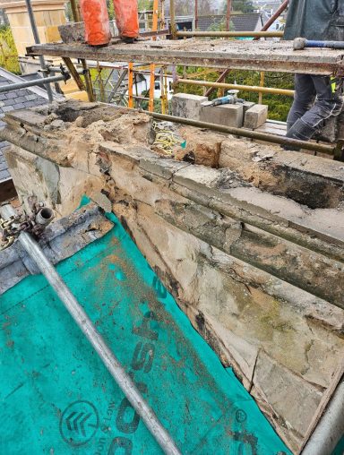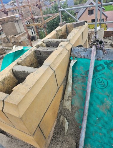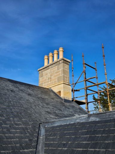 The chimneys underwent a complete overhaul, with our skilled team stripping them down and replacing damaged stones. Each new stone was hand-dressed on site to match the existing aesthetic. We also created numerous new openings, both inside and outside the building, seemlessly integrating them with the original design.